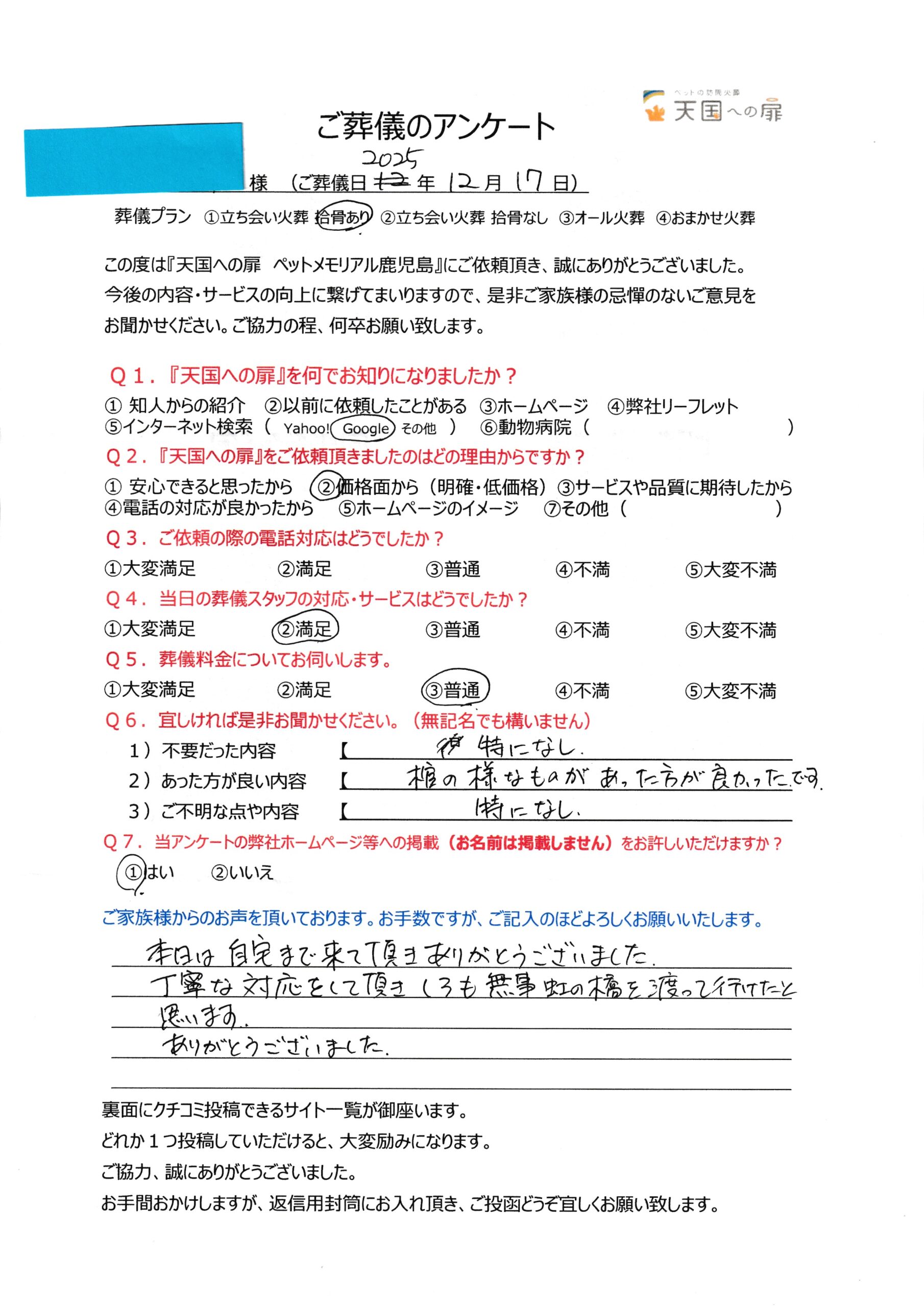 丁寧な対応をして頂き しろも無事虹の橋を渡って行けたと思います。