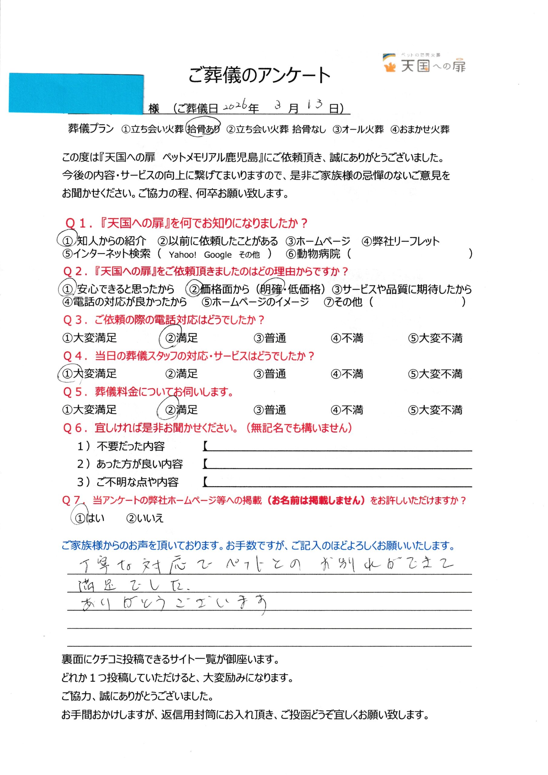 丁寧な対応でペットとの お別れができて満足でした。